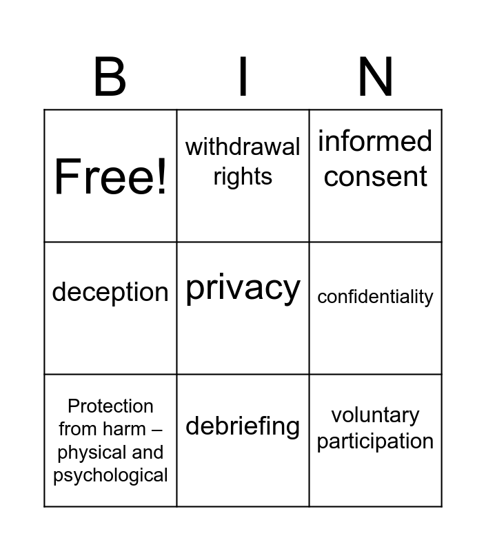 This bingo card has 9 words: Protection from harm – physical and psychological, informed consent, withdrawal rights, deception, Free!, confidentiality, privacy, voluntary participation and debriefing.