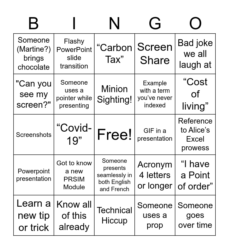 This bingo card has a free space and 25 words: Got to know a new PRSIM Module, Technical Hiccup, Minion Sighting!, Learn a new tip or trick, Bad joke we all laugh at, Someone (Martine?) brings chocolate, "Can you see my screen?", Flashy PowerPoint slide transition, GIF in a presentation, Someone presents seamlessly in both English and French, Example with a term you’ve never indexed, Screenshots, Acronym 4 letters or longer, “I have a Point of order”, Someone uses a pointer while presenting, Favourite/Least Favourite MP’s name, Reference to Alice’s Excel prowess, “Carbon Tax”, “Cost of living”, “Covid-19”, Someone goes over time, Know all of this already, Powerpoint presentation, Screen Share and Someone uses a prop.
