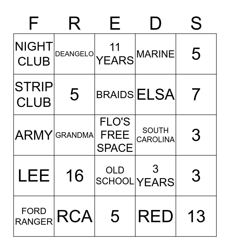 This bingo card has a free space and 24 words: 16, RCA, BRAIDS, FORD RANGER, 5, NIGHT CLUB, STRIP CLUB, DEANGELO, SOUTH CAROLINA, OLD SCHOOL, ELSA, ARMY, 3 YEARS, 3, 5, RED, 3, 11 YEARS, 7, GRANDMA, 13, LEE, MARINE and 5.