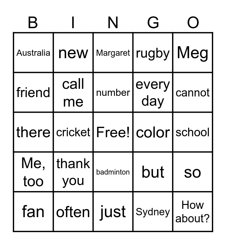 This bingo card has a free space and 29 words: call, often, Margaret, Brown, Meg, Australia, call me, number, color, so, fan, cricket, Sydney, How about?, there, little, just, but, cannot, Me, too, thank you, every, every day, school, friend, new, badminton, rugby and junior high school.