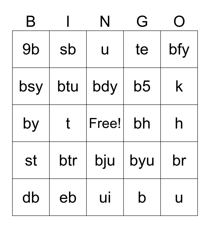 This bingo card has a free space and 24 words: btr, eb, bdy, db, bfy, 9b, bsy, sb, bh, bju, b5, by, byu, br, btu, b, h, u, k, t, u, st, te and ui.