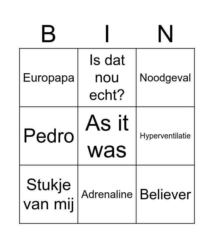 This bingo card has 12 words: Goud, Believer, As it was, Hyperventilatie, Is dat nou echt?, Noodgeval, Adrenaline, Sugardaddy, Europapa, Pedro, Stukje van mij and Speed of light.