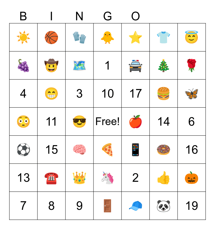 This bingo card has a free space and 59 words: ๐, ๐ณ, โ๏ธ, ๐, ๐, ๐, ๐, ๐ฅถ, ๐ค , ๐, ๐ฅ, ๐, ๐, ๐ง , ๐งข, โ๏ธ, ๐, โญ๏ธ, ๐ธ, ๐, ๐น, ๐งค, ๐ฆ, ๐, ๐ฌ, ๐, โฝ๏ธ, ๐, ๐บ, ๐ฉ, โ๏ธ, โ๏ธ, ๐ช, ๐ผ, ๐, ๐, ๐ฆ, ๐, ๐ฑ, 1, 2, 3, 4, 5, 6, 7, 8, 9, 10, 11, 12, 13, 14, 15, 16, 17, 18, 19 and 20.