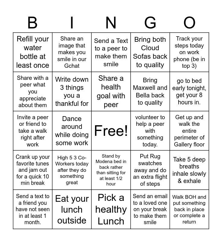 This bingo card has a free space and 24 words: High 5 3 Co- Workers today after they do something great, Eat your lunch outside, Share a health goal with peer, Send a text to a friend you have not seen in at least 1 month., Track your steps today on work phone (be in top 3), Refill your water bottle at least once, Share with a peer what you appreciate about them, Share an image that makes you smile in our Gchat, volunteer to help a peer with something today., Stand by Modena bed in back rather than sitting for at least 1/2 hour, Bring Maxwell and Bella back to quality, Invite a peer or friend to take a walk right after work, Put Rug swatches away and do an extra flight of steps, Take 5 deep breaths inhale slowly & exhale, Write down 3 things you a thankful for, Send an email to a loved one on your break to make them smile, Get up and walk the entire perimeter of Gallery floor, Send a Text to a peer to make them smile, go to bed early tonight, get your 8 hours in., Dance around while doing some work, Walk BOH and put something back in place or complete a return, Crank up your favorite tunes and jam out for a quick 10 min break, Bring both Cloud Sofas back to quality and Pick a healthy Lunch.