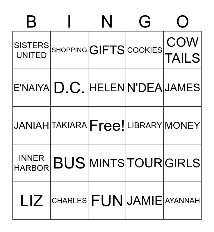 This bingo card has a free space and 24 words: BUS, CHARLES, HELEN, LIZ, COW TAILS, SISTERS UNITED, E'NAIYA, SHOPPING, LIBRARY, MINTS, N'DEA, JANIAH, TOUR, GIRLS, D.C., JAMIE, MONEY, GIFTS, JAMES, TAKIARA, AYANNAH, INNER HARBOR, COOKIES and FUN.