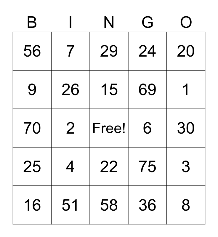 This bingo card has a free space and 24 words: 4, 51, 15, 16, 20, 56, 9, 7, 6, 22, 69, 70, 75, 3, 26, 36, 30, 29, 1, 2, 8, 25, 24 and 58.
