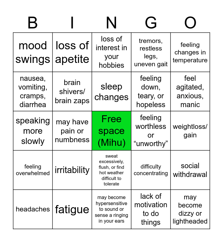 This bingo card has a free space and 24 words: irritability, fatigue, sleep changes, headaches, feeling changes in temperature, mood swings, nausea, vomiting, cramps, diarrhea, loss of apetite, feeling worthless or “unworthy”, sweat excessively, flush, or find hot weather difficult to tolerate, feeling down, teary, or hopeless, speaking more slowly, difficulty concentrating, social withdrawal, brain shivers/ brain zaps, lack of motivation to do things, weightloss/ gain, loss of interest in your hobbies, feel agitated, anxious, manic, may have pain or numbness, may become dizzy or lightheaded, feeling overwhelmed, tremors, restless legs, uneven gait and may become hypersensitive to sound or sense a ringing in your ears.