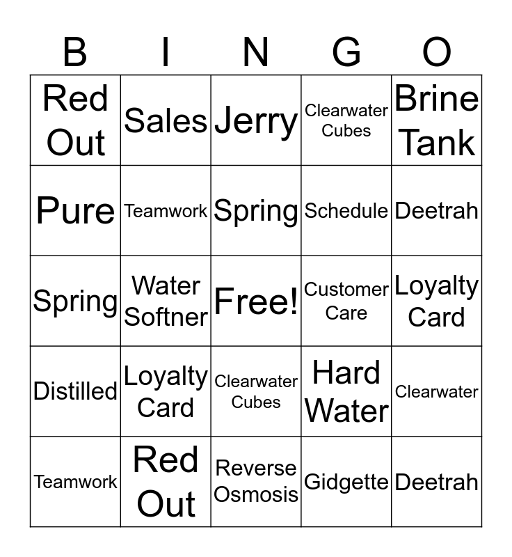 This bingo card has a free space and 28 words: Clearwater, Install, Schedule, Gidgette, Pure, Jerry, Sales, Distilled, Customer Care, Teamwork, Spring, Clearwater Cubes, Red Out, Reverse Osmosis, Deetrah, Water Softner, Loyalty Card, Teamwork, Spring, Clearwater Cubes, Red Out, Reverse Osmosis, Deetrah, Water Softner, Loyalty Card, Hard Water, Brine Tank and Bypass.