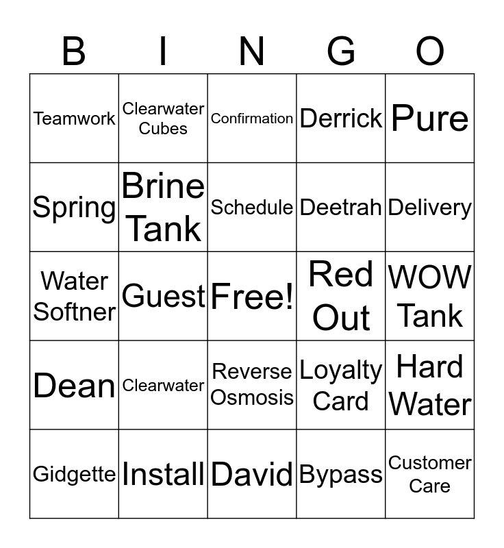 This bingo card has a free space and 24 words: Clearwater, Install, Schedule, Gidgette, Pure, Teamwork, Spring, Clearwater Cubes, Red Out, Reverse Osmosis, Deetrah, Water Softner, Loyalty Card, Hard Water, Brine Tank, Bypass, WOW Tank, Confirmation, Delivery, Guest, Customer Care, Dean, Derrick and David.