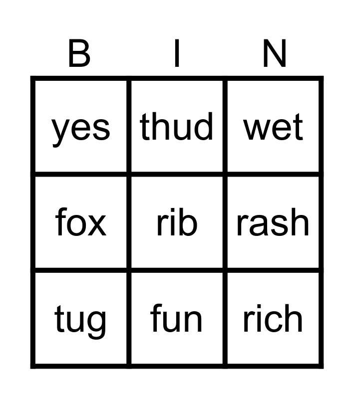 This bingo card has a free space and 17 words: map, zap, wet, yes, big, fox, sob, tug, fun, rash, shed, chip, rich, thud, with, rock and luck.