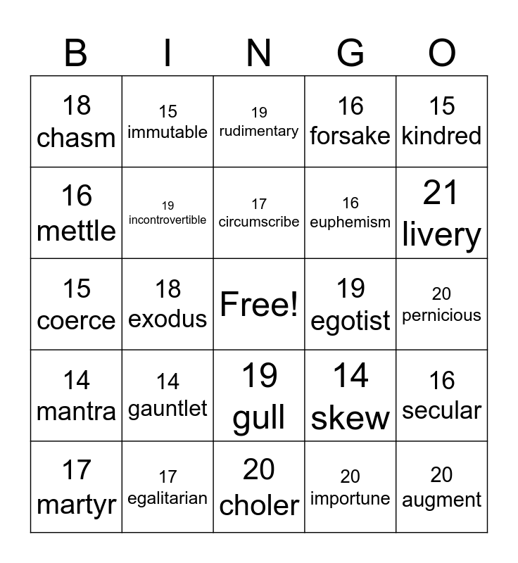 This bingo card has a free space and 30 words: 17 egalitarian, 18 gird, 18 exodus, 18 denounce, 18 chasm, 19 rudimentary, 19 incontrovertible, 19 gull, 19 egotist, 20 choler, 20 pernicious, 20 augment, 20 importune, 21 jest, 21 livery, 14 asylum, 14 skew, 14 mantra, 14 gauntlet, 15 kindred, 15 coerce, 15 subterfuge, 15 immutable, 16 euphemism, 16 mettle, 16 forsake, 16 secular, 17 martyr, 17 circumscribe and 17 mecca.