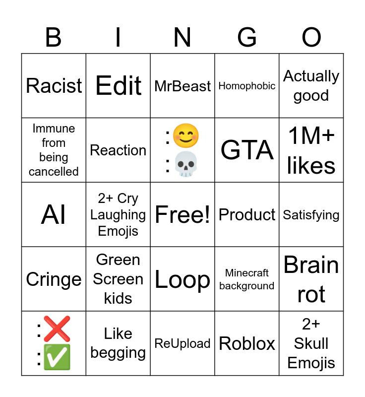 This bingo card has a free space and 24 words: Green Screen kids, Like begging, :😊 :💀, :❌ :✅, Actually good, Racist, Immune from being cancelled, Edit, Product, Loop, GTA, AI, Minecraft background, Brain rot, Reaction, Roblox, Satisfying, MrBeast, 1M+ likes, 2+ Cry Laughing Emojis, 2+ Skull Emojis, Cringe, Homophobic and ReUpload.