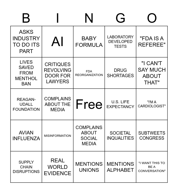 This bingo card has a free space and 24 words: MISINFORMATION, REAL WORLD EVIDENCE, FDA REORGANIZATION, SUPPLY CHAIN DISRUPTIONS, "FDA IS A REFEREE", ASKS INDUSTRY TO DO ITS PART, LIVES SAVED FROM MENTHOL BAN, AI, U.S. LIFE EXPECTANCY, COMPLAINS ABOUT SOCIAL MEDIA, DRUG SHORTAGES, REAGAN-UDALL FOUNDATION, SOCIETAL INQUALITIES, SUBTWEETS CONGRESS, CRITIQUES REVOLVING DOOR FOR LAWYERS, MENTIONS ALPHABET, "I'M A CARDIOLOGIST", BABY FORMULA, "I CAN'T SAY MUCH ABOUT THAT", COMPLAINS ABOUT THE MEDIA, "I WANT THIS TO BE A CONVERSATION", AVIAN INFLUENZA, LABORATORY DEVELOPED TESTS and MENTIONS UNIONS.