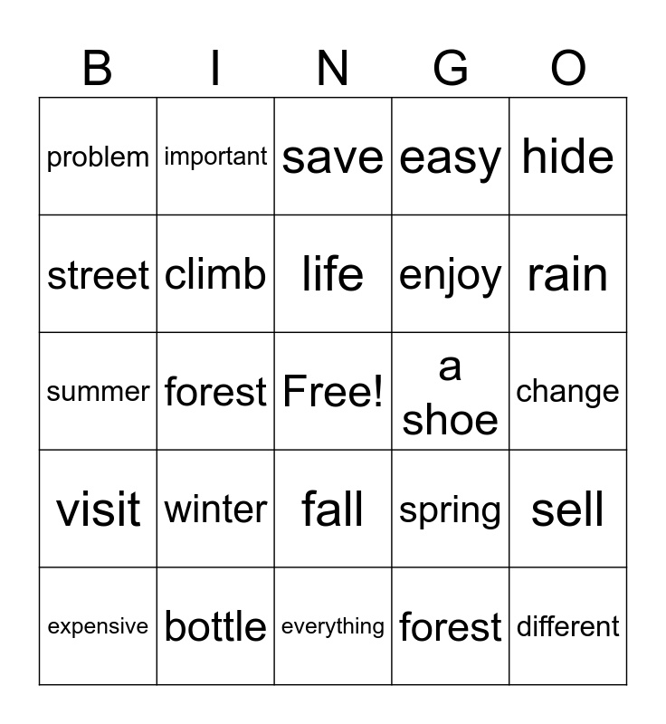 This bingo card has a free space and 34 words: build, forest, cut down, cut, visit, climb, hide, expensive, important, interesting, life, save, trip, clock, a shoe, rain, bottle, summer, winter, spring, fall, color, problem, change, everything, different, easy, hard, enjoy, street, went, forest, sell and came.