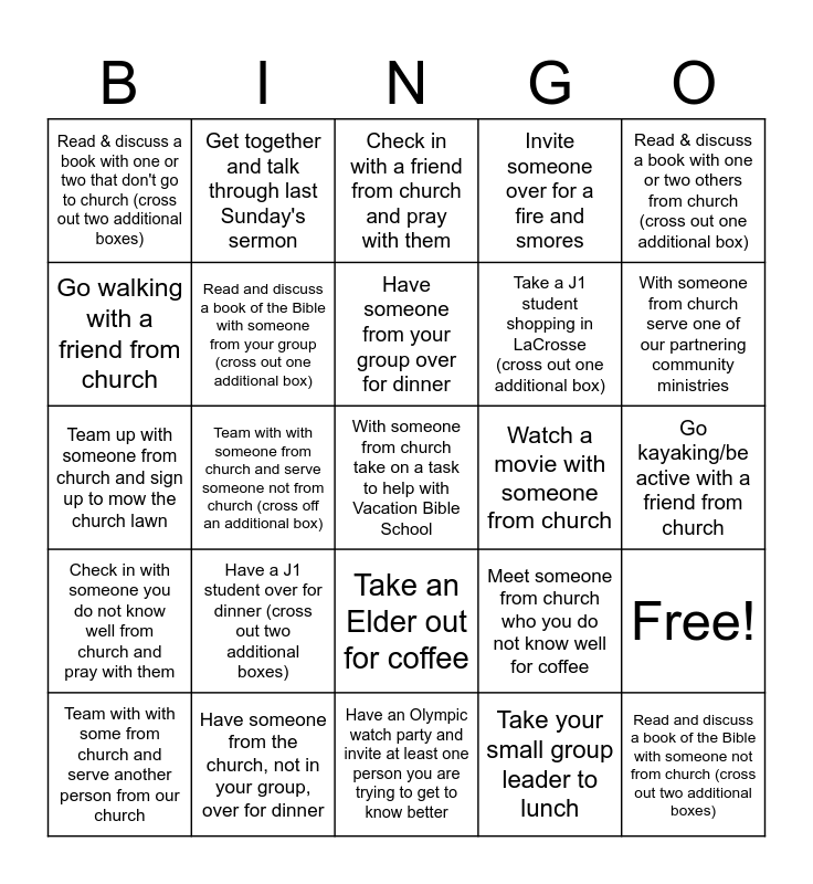 This bingo card has 26 words: Take an Elder out for coffee, Take your small group leader to lunch, Have someone from your group over for dinner, Have someone from the church, not in your group, over for dinner, Read & discuss a book with one or two others from church (cross out one additional box), Read & discuss a book with one or two that don't go to church (cross out two additional boxes), Go walking with a friend from church, Get together and talk through last Sunday's sermon, Go kayaking/be active with a friend from church, Meet someone from church who you do not know well for coffee, Take a J1 student shopping in LaCrosse (cross out one additional box), Team up with someone from church and sign up to mow the church lawn, Free!, Team with with some from church and serve another person from our church, Team with with someone from church and serve someone not from church (cross off an additional box), Go fishing with someone from church, Invite someone over for a fire and smores, Check in with someone you do not know well from church and pray with them, Check in with a friend from church and pray with them, With someone from church take on a task to help with Vacation Bible School, With someone from church serve one of our partnering community ministries, Have an Olympic watch party and invite at least one person you are trying to get to know better, Watch a movie with someone from church, Have a J1 student over for dinner (cross out two additional boxes), Read and discuss a book of the Bible with someone from your group (cross out one additional box) and Read and discuss a book of the Bible with someone not from church (cross out two additional boxes).
