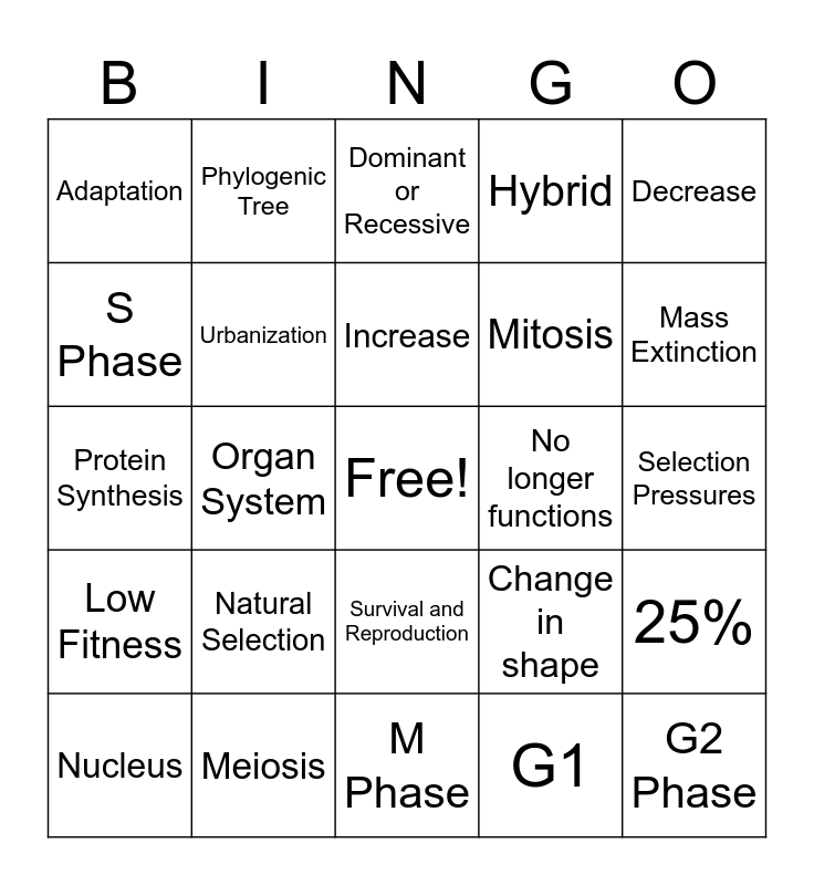 This bingo card has a free space and 24 words: Nucleus, Natural Selection, Increase, G1, Decrease, Adaptation, Phylogenic Tree, Dominant or Recessive, No longer functions, Selection Pressures, Protein Synthesis, Urbanization, Change in shape, 25%, S Phase, Meiosis, M Phase, Hybrid, Mass Extinction, Low Fitness, Organ System, Survival and Reproduction, Mitosis and G2 Phase.