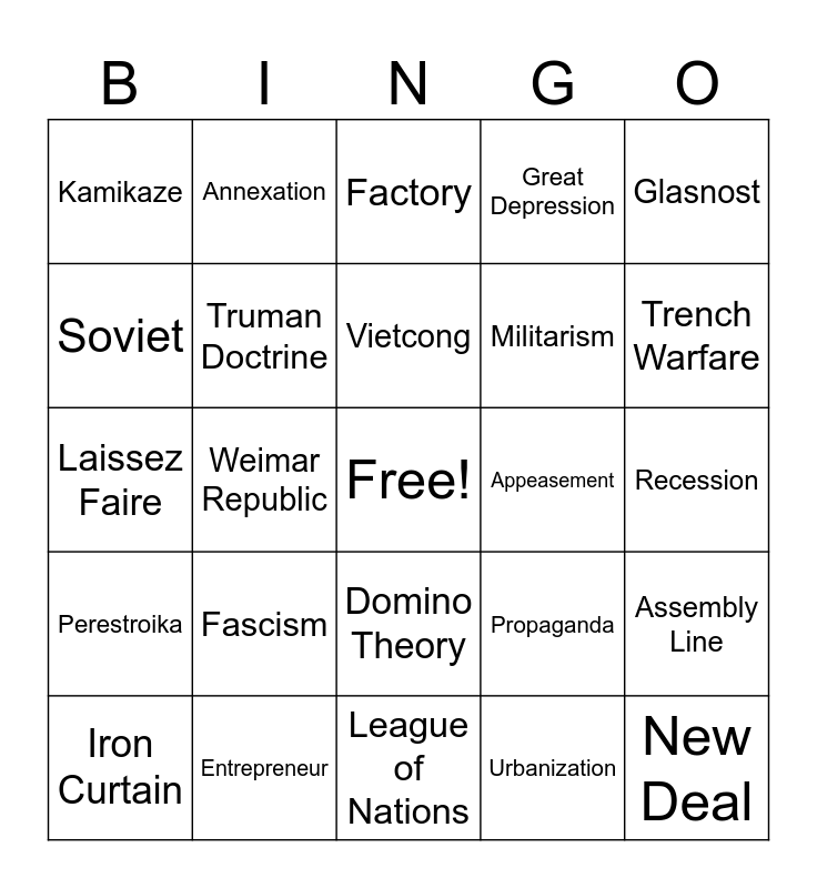 This bingo card has a free space and 39 words: Cold War, United Nations, Containment, Truman Doctrine, Iron Curtain, Domino Theory, Vietcong, Detente, Glasnost, Perestroika, Weimar Republic, Great Depression, New Deal, Recession, Appeasement, Fascism, Blitzkrieg, Kamikaze, Total War, Propaganda, Soviet, League of Nations, Militarism, Trench Warfare, Treaty of Versailles, Imperialism, Racism, Berlin Conference, Assimilation, Annexation, Industrial Revolution, Mass Production, Factory, Entrepreneur, Urbanization, Middle Class, Assembly Line, Laissez Faire and Union.