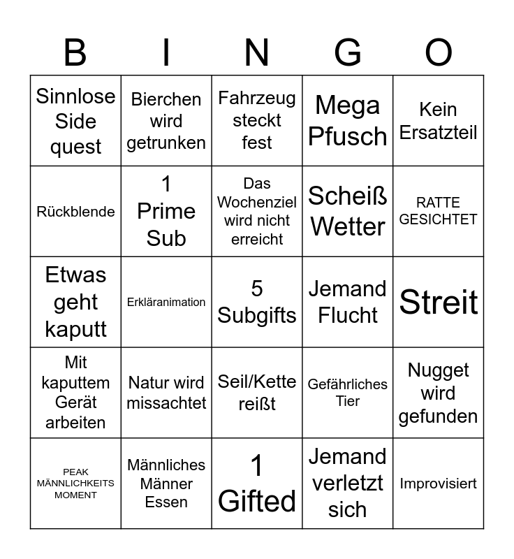 This bingo card has a free space and 24 words: Natur wird missachtet, Männliches Männer Essen, Das Wochenziel wird nicht erreicht, PEAK MÄNNLICHKEITS MOMENT, Kein Ersatzteil, Sinnlose Side quest, Rückblende, Bierchen wird getrunken, Jemand Flucht, Seil/Kette reißt, Scheiß Wetter, Etwas geht kaputt, Gefährliches Tier, Nugget wird gefunden, 1 Prime Sub, Jemand verletzt sich, Streit, Fahrzeug steckt fest, RATTE GESICHTET, Erkläranimation, Improvisiert, Mit kaputtem Gerät arbeiten, Mega Pfusch and 1 Gifted.