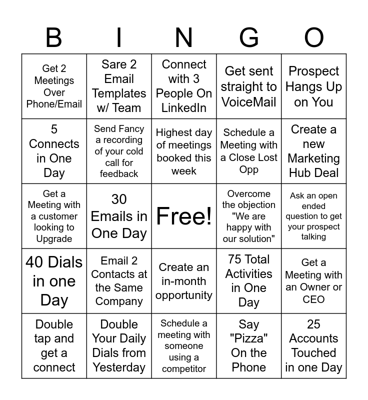This bingo card has a free space and 24 words: Email 2 Contacts at the Same Company, Double Your Daily Dials from Yesterday, Highest day of meetings booked this week, Double tap and get a connect, Prospect Hangs Up on You, Get 2 Meetings Over Phone/Email, 5 Connects in One Day, Sare 2 Email Templates w/ Team, Overcome the objection "We are happy with our solution", Create an in-month opportunity, Schedule a Meeting with a Close Lost Opp, Get a Meeting with a customer looking to Upgrade, 75 Total Activities in One Day, Get a Meeting with an Owner or CEO, Send Fancy a recording of your cold call for feedback, Say "Pizza" On the Phone, Ask an open ended question to get your prospect talking, Connect with 3 People On LinkedIn, Create a new Marketing Hub Deal, 30 Emails in One Day, 25 Accounts Touched in one Day, 40 Dials in one Day, Get sent straight to VoiceMail and Schedule a meeting with someone using a competitor.