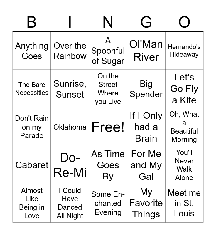 This bingo card has a free space and 24 words: Do-Re-Mi, I Could Have Danced All Night, On the Street Where you Live, Almost Like Being in Love, Hernando's Hideaway, Anything Goes, The Bare Necessities, Over the Rainbow, If I Only had a Brain, As Time Goes By, Big Spender, Don't Rain on my Parade, For Me and My Gal, You'll Never Walk Alone, Sunrise, Sunset, My Favorite Things, Oh, What a Beautiful Morning, A Spoonful of Sugar, Let's Go Fly a Kite, Oklahoma, Meet me in St. Louis, Cabaret, Ol'Man River and Some En-chanted Evening.
