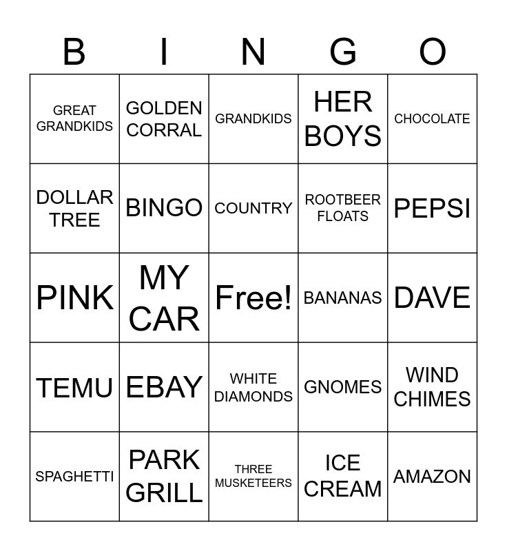 This bingo card has a free space and 24 words: SPAGHETTI, EBAY, COUNTRY, ICE CREAM, CHOCOLATE, GREAT GRANDKIDS, GOLDEN CORRAL, GRANDKIDS, BANANAS, DAVE, PINK, BINGO, GNOMES, WIND CHIMES, DOLLAR TREE, PARK GRILL, THREE MUSKETEERS, HER BOYS, PEPSI, TEMU, MY CAR, WHITE DIAMONDS, ROOTBEER FLOATS and AMAZON.