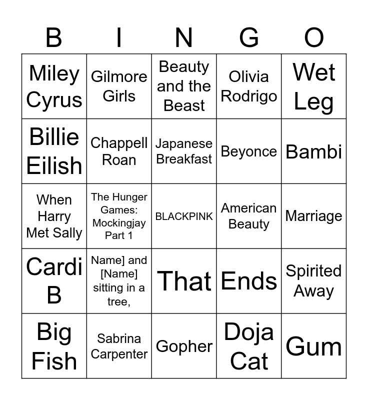 This bingo card has 60 words: Megan Thee Stallion, Sabrina Carpenter, Ice Spice, Cardi B, Doja Cat, Charli XCX, Chappell Roan, Ariana Grande, Beyonce, Dua Lipa, Olivia Rodrigo, Mitski, Billie Eilish, Nicki Minaj, Taylor Swift, Miley Cyrus, BLACKPINK, Wet Leg, boygenius, Japanese Breakfast, American Beauty, Beauty and the Beast, Big Fish, Spirited Away, The Room, Lost in Translation, Black Swan, The Wizard of Oz, Bambi, The Great Gatsby, Alice in Wonderland, The Devil Wears Prada, Caddyshack, Eclipse, Gilmore Girls, Memoirs of a Geisha, Vertigo, The Hunger Games: Mockingjay Part 1, Harold and Maude, When Harry Met Sally, Midsommar, Name] and [Name] sitting in a tree,, Marriage, Stream, Ends, Posies, Cootie, Yolk, Pass, That, Gopher, Bumped, Sticks, Sneezed, Button, Fair Lady, Nose, Bullfrog, Gum and Switch.
