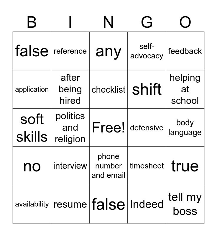 This bingo card has a free space and 24 words: interview, resume, checklist, availability, feedback, false, application, reference, defensive, phone number and email, shift, soft skills, timesheet, true, after being hired, Indeed, body language, any, helping at school, politics and religion, tell my boss, no, self-advocacy and false.
