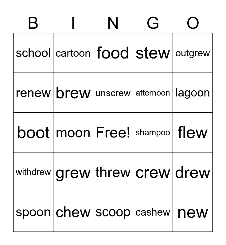 This bingo card has a free space and 24 words: grew, chew, unscrew, spoon, outgrew, school, renew, cartoon, shampoo, threw, afternoon, boot, crew, drew, brew, cashew, flew, food, lagoon, moon, new, withdrew, stew and scoop.
