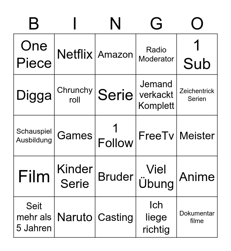 This bingo card has a free space and 24 words: Kinder Serie, Naruto, Serie, Seit mehr als 5 Jahren, 1 Sub, One Piece, Digga, Netflix, FreeTv, Bruder, Jemand verkackt Komplett, Schauspiel Ausbildung, Viel Übung, Anime, Chrunchy roll, Ich liege richtig, Meister, Amazon, Zeichentrick Serien, Games, Dokumentar filme, Film, Radio Moderator and Casting.
