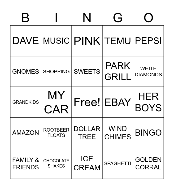 This bingo card has a free space and 24 words: FAMILY & FRIENDS, ROOTBEER FLOATS, SWEETS, SPAGHETTI, PEPSI, DAVE, MUSIC, PINK, EBAY, HER BOYS, GRANDKIDS, SHOPPING, WIND CHIMES, BINGO, GNOMES, CHOCOLATE SHAKES, ICE CREAM, TEMU, WHITE DIAMONDS, AMAZON, MY CAR, DOLLAR TREE, PARK GRILL and GOLDEN CORRAL.