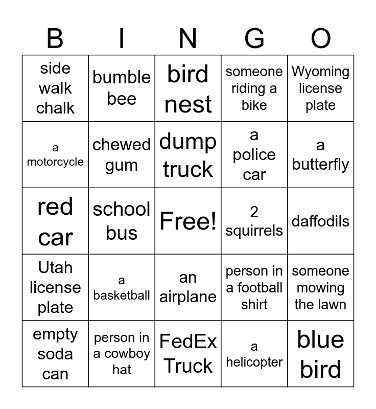 This bingo card has a free space and 40 words: coins, red car, barking dog, chewed gum, person in a cowboy hat, an airplane, dump truck, pine cone, Wyoming license plate, Utah license plate, school bus, someone riding a bike, blue bird, daffodils, 2 squirrels, a basketball, someone riding a skateboard, side walk chalk, a rabbit, bird nest, someone mowing the lawn, a helicopter, a police car, a motorcycle, house with a purple door, a stroller, someone wearing a baseball cap, a white van, person wearing shorts & sandals, a cat, high school students, empty soda can, a tree swing, person in a football shirt, a butterfly, FedEx Truck, Pizza delivery car, Mrs. Orr, bumble bee and person with green shorts.