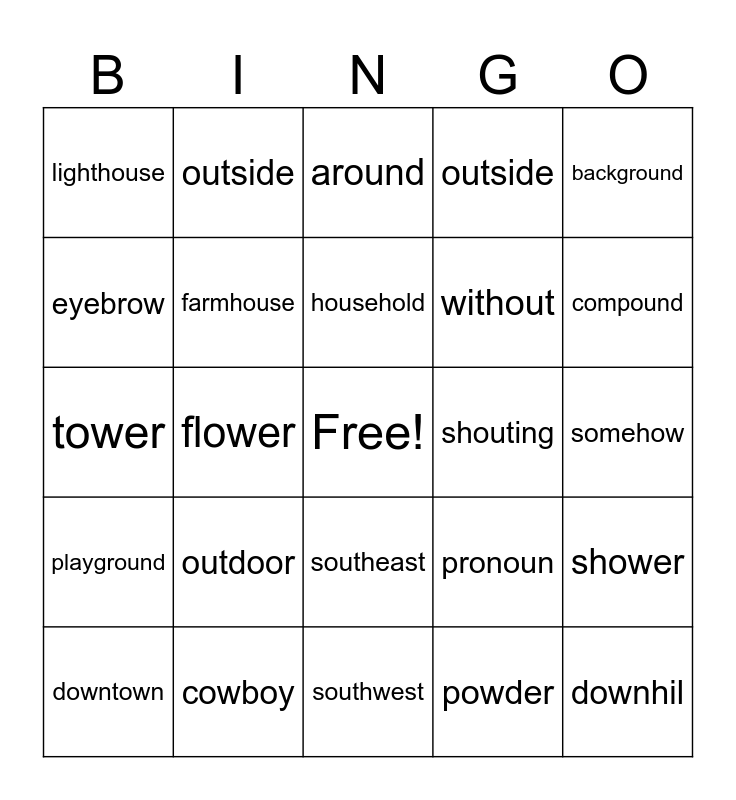 This bingo card has a free space and 24 words: downtown, outdoor, household, powder, background, lighthouse, outside, around, shouting, somehow, tower, farmhouse, pronoun, shower, eyebrow, cowboy, southwest, outside, compound, playground, flower, southeast, without and downhil.