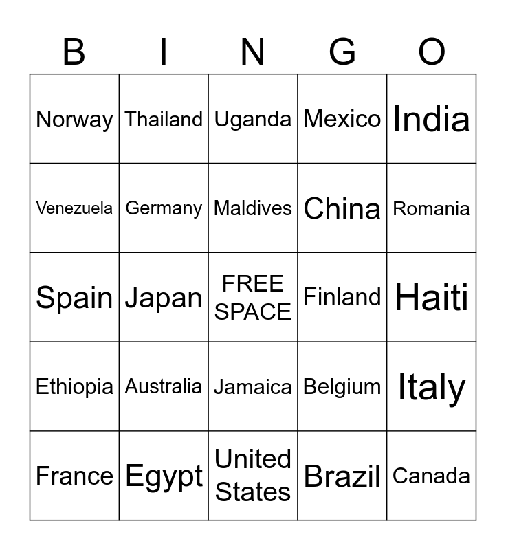 This bingo card has a free space and 29 words: France, Argentina, Japan, Guam, Norway, Uganda, Germany, Australia, Finland, Egypt, Haiti, Canada, United States, Brazil, Romania, Greece, Jamaica, Ethiopia, India, Spain, Belgium, Turkey, China, Venezuela, Mexico, Thailand, Italy, Maldives and Cuba.