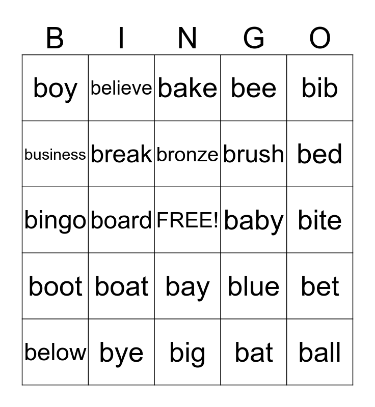 This bingo card has a free space and 24 words: boat, bye, bronze, below, bib, boy, business, believe, baby, bay, brush, bingo, blue, bet, break, bat, bite, bake, bed, board, ball, boot, bee and big.