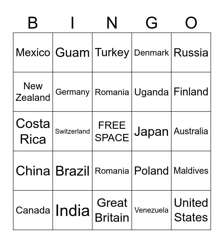 This bingo card has a free space and 29 words: Canada, Ethiopia, Switzerland, Belgium, Mexico, Turkey, Germany, Brazil, Japan, India, Australia, United States, Great Britain, Venezuela, Finland, Spain, Romania, China, Russia, Costa Rica, Poland, Jamaica, Uganda, New Zealand, Denmark, Guam, Maldives, Romania and France.