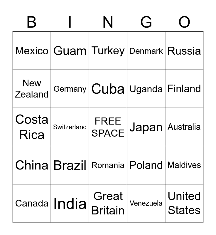 This bingo card has a free space and 29 words: Canada, Ethiopia, Switzerland, Belgium, Mexico, Turkey, Germany, Brazil, Japan, India, Australia, United States, Great Britain, Venezuela, Finland, Spain, Romania, China, Russia, Costa Rica, Poland, Jamaica, Uganda, New Zealand, Denmark, Guam, Maldives, Cuba and France.