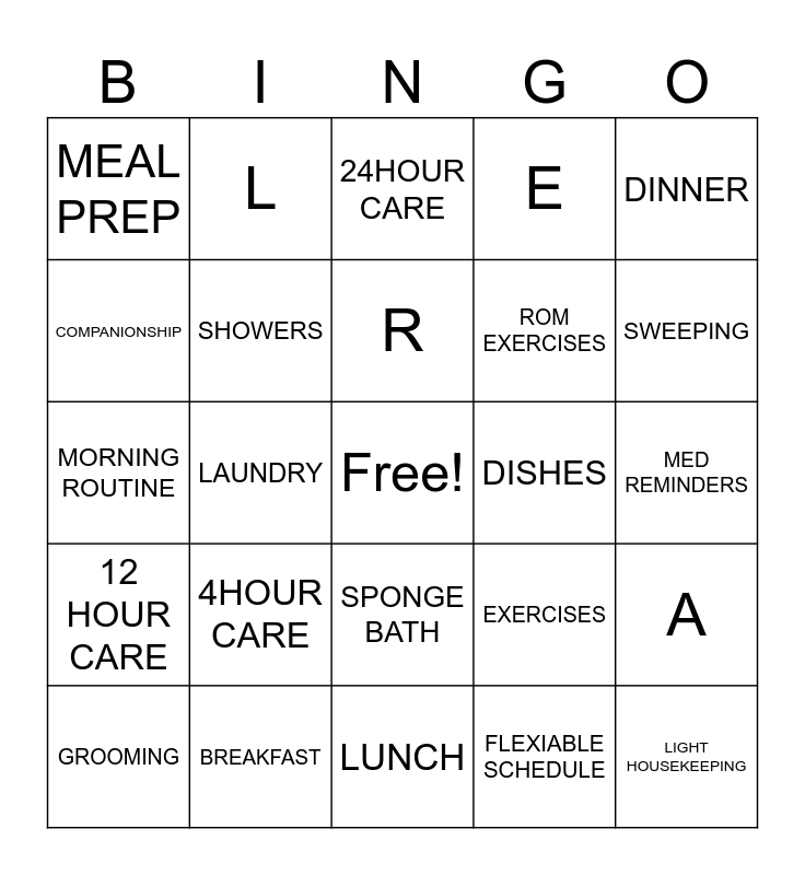 This bingo card has a free space and 29 words: GROOMING, TOILETING, LAUNDRY, TRANSPRTATION, MEAL PREP, 24HOUR CARE, SHOWERS, 4HOUR CARE, DISHES, BREAKFAST, MED REMINDERS, LIGHT HOUSEKEEPING, LUNCH, FLEXIABLE SCHEDULE, SWEEPING, EVENING ROUTING, SPONGE BATH, 12 HOUR CARE, DINNER, MORNING ROUTINE, EXERCISES, MOPING, ROM EXERCISES, COMPANIONSHIP, E, L, A, R and A.