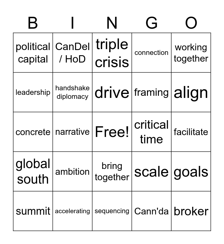 This bingo card has a free space and 38 words: civil society, G7, likemindeds, handshake diplomacy, goals, ambition, drive, keep 1.5 in reach, working together, framing, narrative, connection, broker, facilitate, leadership, global south, partner, triple crisis, action, critical time, political capital, accelerating, align, summit, flesh out / build out, sequencing, SG, come back to this, deliverable, amplify, energize, bring together, Cann'da, CanDel / HoD, innovative, scale, concrete and presidency.