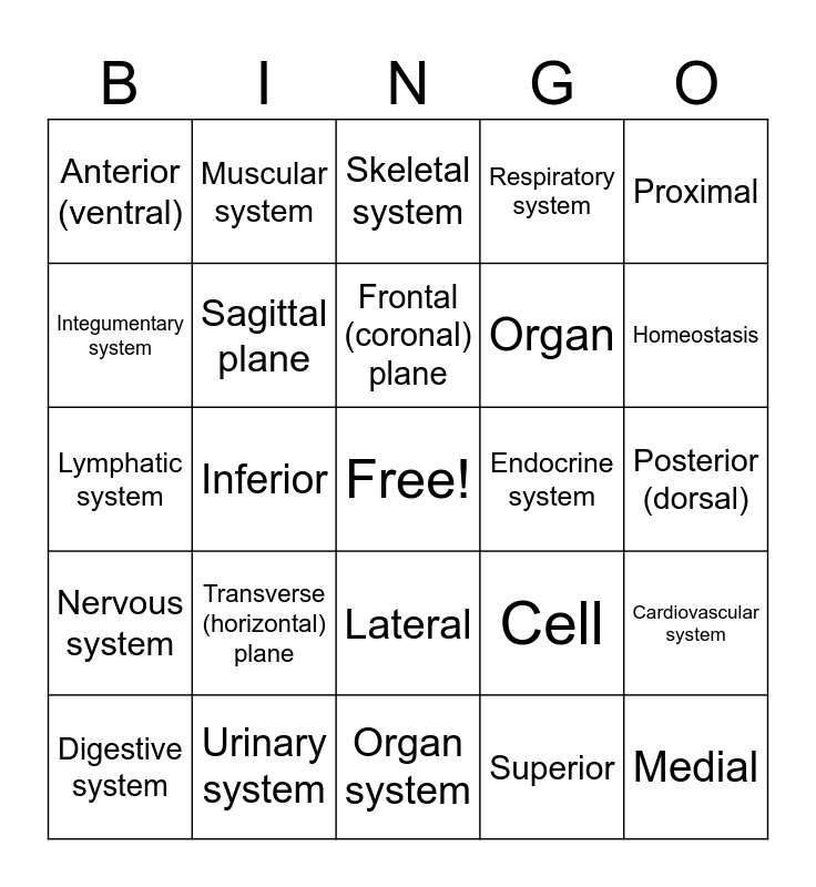 This bingo card has a free space and 27 words: Cell, Tissue, Organ, Organ system, Integumentary system, Skeletal system, Muscular system, Nervous system, Endocrine system, Cardiovascular system, Lymphatic system, Respiratory system, Digestive system, Urinary system, Homeostasis, Anatomical position, Sagittal plane, Frontal (coronal) plane, Transverse (horizontal) plane, Anterior (ventral), Posterior (dorsal), Superior, Inferior, Medial, Lateral, Proximal and Distal.