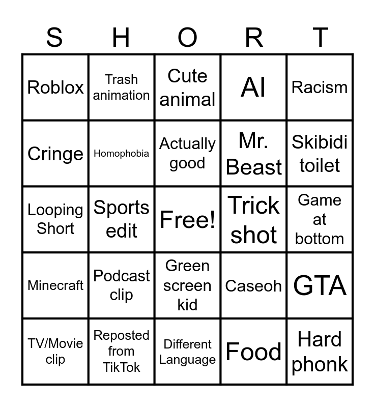 This bingo card has a free space and 24 words: Podcast clip, Reposted from TikTok, Actually good, TV/Movie clip, Racism, Roblox, Cringe, Trash animation, Trick shot, Green screen kid, Mr. Beast, Looping Short, Caseoh, GTA, Homophobia, Food, Game at bottom, Cute animal, Skibidi toilet, Sports edit, Hard phonk, Minecraft, AI and Different Language.