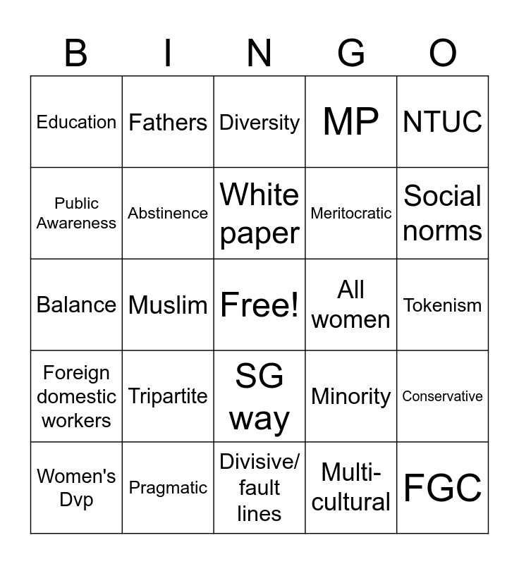 This bingo card has a free space and 24 words: Tripartite, Pragmatic, White paper, Women's Dvp, NTUC, Education, Public Awareness, Fathers, All women, SG way, Meritocratic, Balance, Minority, Conservative, Abstinence, Multi-cultural, Tokenism, Diversity, Social norms, Muslim, FGC, Foreign domestic workers, MP and Divisive/ fault lines.