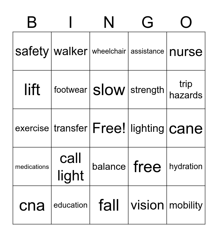 This bingo card has a free space and 25 words: call light, fall, slow, cna, nurse, safety, lift, walker, lighting, balance, strength, exercise, free, hydration, footwear, prevention, cane, wheelchair, trip hazards, transfer, mobility, education, medications, assistance and vision.