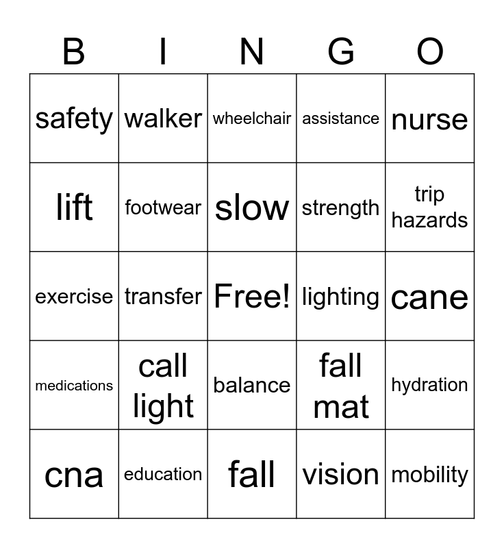 This bingo card has a free space and 25 words: call light, fall, slow, cna, nurse, safety, lift, walker, lighting, balance, strength, exercise, fall mat, hydration, footwear, prevention, cane, wheelchair, trip hazards, transfer, mobility, education, medications, assistance and vision.