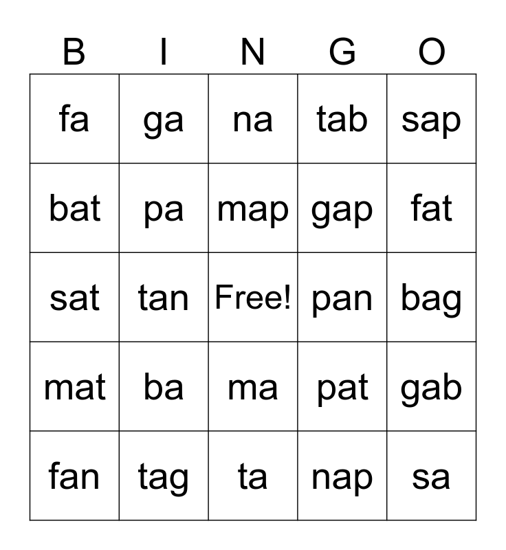 This bingo card has a free space and 24 words: ba, tag, map, fan, sap, fa, bat, ga, pan, ma, gap, sat, pat, gab, pa, nap, bag, na, fat, tan, sa, mat, tab and ta.