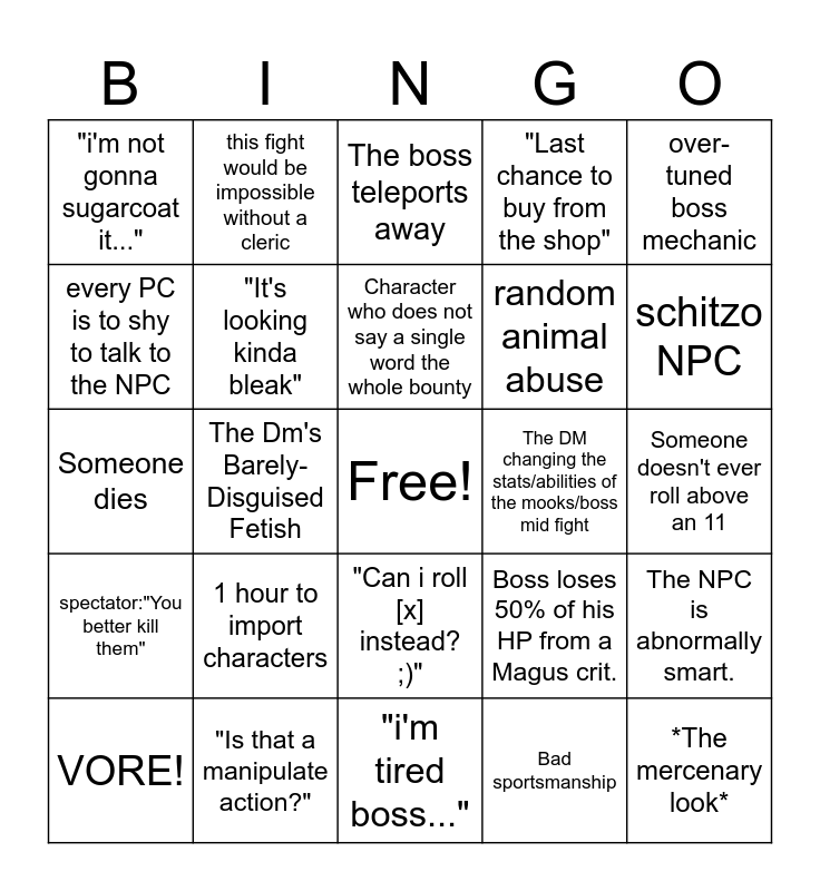 This bingo card has a free space and 24 words: 1 hour to import characters, "Is that a manipulate action?", Character who does not say a single word the whole bounty, VORE!, over-tuned boss mechanic, "i'm not gonna sugarcoat it...", every PC is to shy to talk to the NPC, this fight would be impossible without a cleric, The DM changing the stats/abilities of the mooks/boss mid fight, "Can i roll [x] instead? ;)", random animal abuse, Someone dies, Boss loses 50% of his HP from a Magus crit., The NPC is abnormally smart., "It's looking kinda bleak", Bad sportsmanship, Someone doesn't ever roll above an 11, The boss teleports away, schitzo NPC, The Dm's Barely-Disguised Fetish, *The mercenary look*, spectator:"You better kill them", "Last chance to buy from the shop" and "i'm tired boss...".