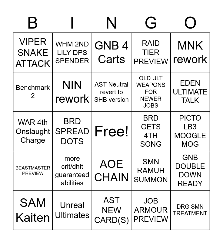 This bingo card has a free space and 24 words: more crit/dhit guaranteed abilities, Unreal Ultimates, AST Neutral revert to SHB version, SAM Kaiten, MNK rework, VIPER SNAKE ATTACK, Benchmark 2, WHM 2ND LILY DPS SPENDER, BRD GETS 4TH SONG, AOE CHAIN, OLD ULT WEAPONS FOR NEWER JOBS, WAR 4th Onslaught Charge, SMN RAMUH SUMMON, GNB DOUBLE DOWN READY, NIN rework, JOB ARMOUR PREVIEW, PICTO LB3 MOOGLE MOG, GNB 4 Carts, EDEN ULTIMATE TALK, BRD SPREAD DOTS, DRG SMN TREATMENT, BEASTMASTER PREVIEW, RAID TIER PREVIEW and AST NEW CARD(S).