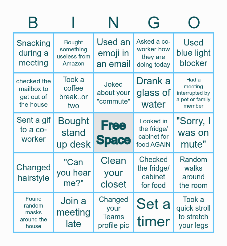 This bingo card has a free space and 51 words: Technical issues, "Can you hear me?", Try new recipes for dinner, Set a timer, Had a meeting interrupted by a pet or family member, Wore PJ bottoms to a meeting, Bought something useless from Amazon, Did household chores on your lunch break, Drank a glass of water, Took a quick stroll to stretch your legs, Sent a gif to a co-worker, Took a coffee break..or two, Checked the fridge/ cabinet for food, "Sorry, I was on mute", "Can everyone see my screen?", Catch up with co-workers, Used an emoji in an email, Looked in the fridge/ cabinet for food AGAIN, Worked in a different room to shake things up, checked the mailbox to get out of the house, Bought stand up desk, Forgot to brush teeth, Asked a co-worker how they are doing today, Used blue light blocker, Started a garden, What day is it?, Joked about your "commute", Experimented with coffee flavors, Random walks around the room, Snacking during a meeting, Forget to brush teeth again, See it say it fix it, Clean your keyboard, Join a meeting early, Read a book, Reminisce of working in the office, Adopt a pet, Internet Issues, Discover new snacks, Neighbors loudly mowing their lawn, Join a meeting late, Clean your closet, What year is it?, Go to a park, Found random masks around the house, Binge watch a new series, Changed your Teams profile pic, Ate breakfast for lunch, Used Focus time, Changed hairstyle and Overstock on hand sanitizer.