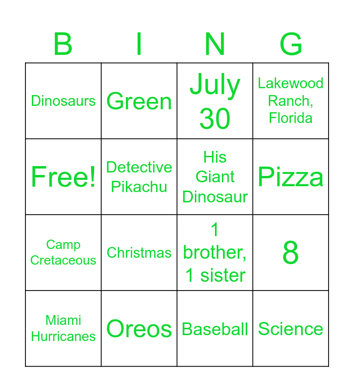 This bingo card has 16 words: Oreos, 8, July 30, Dinosaurs, Camp Cretaceous, Green, 1 brother, 1 sister, Baseball, Free!, Detective Pikachu, Miami Hurricanes, Lakewood Ranch, Florida, Christmas, Pizza, His Giant Dinosaur and Science.