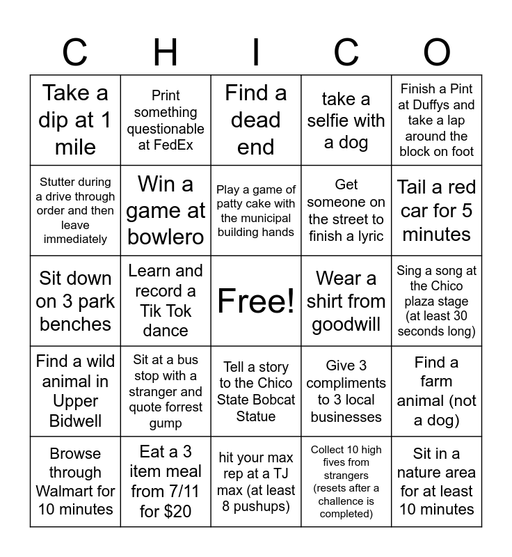This bingo card has a free space and 24 words: Browse through Walmart for 10 minutes, Sit at a bus stop with a stranger and quote forrest gump, Play a game of patty cake with the municipal building hands, Collect 10 high fives from strangers (resets after a challence is completed), Finish a Pint at Duffys and take a lap around the block on foot, Take a dip at 1 mile, Print something questionable at FedEx, Find a dead end, Wear a shirt from goodwill, Sing a song at the Chico plaza stage (at least 30 seconds long), Sit down on 3 park benches, Win a game at bowlero, Give 3 compliments to 3 local businesses, Find a farm animal (not a dog), Stutter during a drive through order and then leave immediately, Eat a 3 item meal from 7/11 for $20, hit your max rep at a TJ max (at least 8 pushups), take a selfie with a dog, Tail a red car for 5 minutes, Find a wild animal in Upper Bidwell, Learn and record a Tik Tok dance, Tell a story to the Chico State Bobcat Statue, Get someone on the street to finish a lyric and Sit in a nature area for at least 10 minutes.