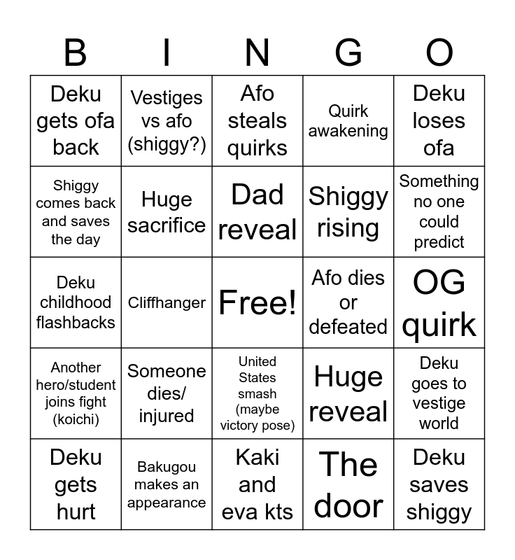 This bingo card has a free space and 24 words: Someone dies/ injured, Bakugou makes an appearance, Dad reveal, Deku gets hurt, Deku loses ofa, Deku gets ofa back, Shiggy comes back and saves the day, Vestiges vs afo (shiggy?), Afo dies or defeated, United States smash (maybe victory pose), Shiggy rising, Deku childhood flashbacks, Huge reveal, Deku goes to vestige world, Huge sacrifice, The door, OG quirk, Afo steals quirks, Something no one could predict, Cliffhanger, Deku saves shiggy, Another hero/student joins fight (koichi), Quirk awakening and Kaki and eva kts.
